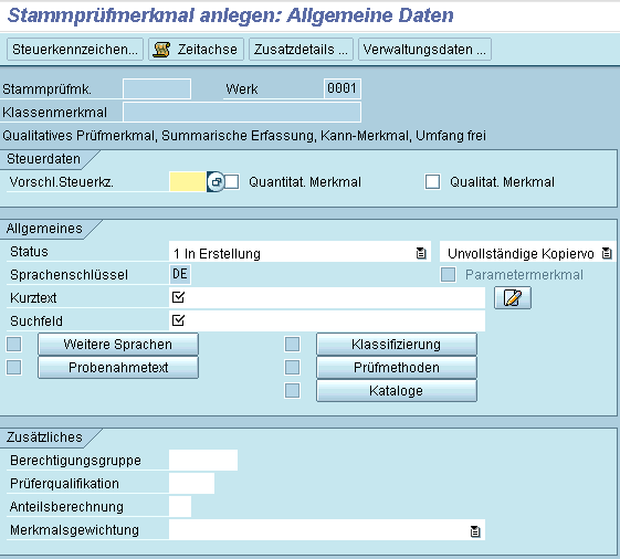 Stammprüfmerkmale werden mit Bezug zu einem Werk (Organisationsstruktur) angelegt: |