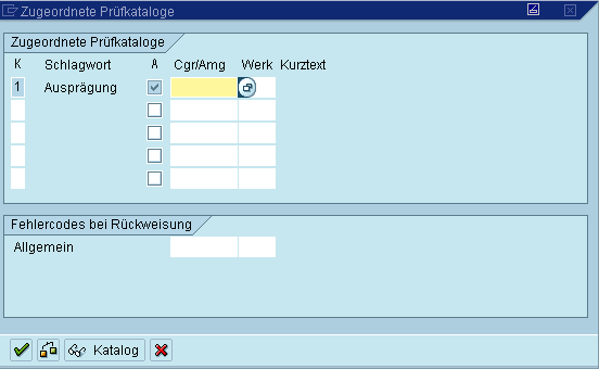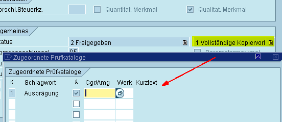 Das System belegt die Katalogart 1, Merkmalsausprägung, schon vor. In dem Feld Cgr/Amg wählen Sie wieder über die Match-Code-Suche, hier im Beispiel die Auswahlmenge FA-R0001,aus. |