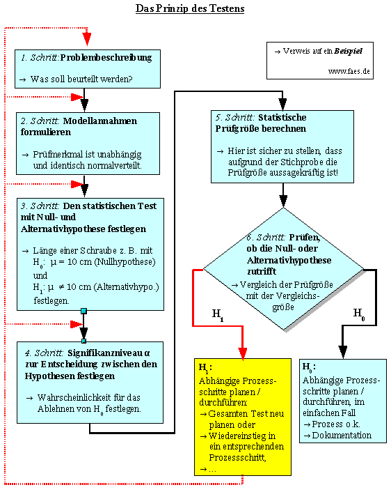 Um Aussagen auf Basis statistischer Tests machen zu können, muss die Durchführung geplant werden. Die folgende Grafik “Das Prinzip des Testens” soll als Leitfaden dienen: |